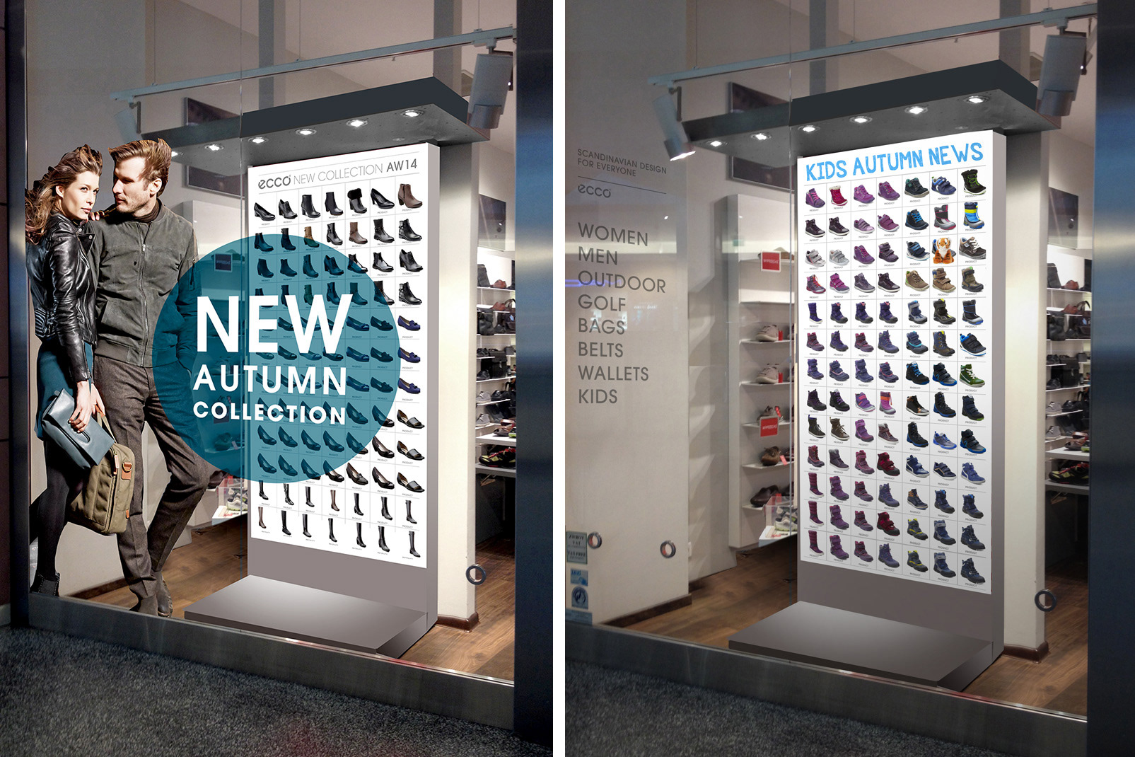 While working for Trojan Gorillas, we worked on an Omni-strategy for ECCO, and did som tests to see what worked best for instore assets. Fx more products on the posters, or windows that reflected weather etc.