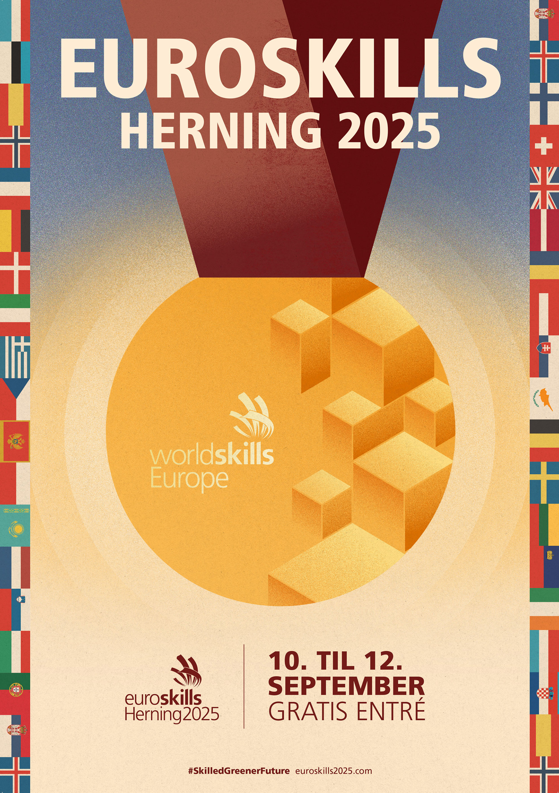 I was responsible for the visual expression and roll-out of brand guidelines and marketing materials for EuroSkills Herning 2025, Europe’s largest championship for young skilled professionals. My work included design of marketing, outdoor and digital advertising, an advertising section in Politiken, and all event and venue materials for MCH Herning Messecenter — from wayfinding systems and signage to over 3,000 metres of printed foil graphics applied across the exhibition halls. The design work spanned both print and digital platforms and contributed to building a unified, high-impact visual identity for one of Denmark’s largest educational events. (2025)