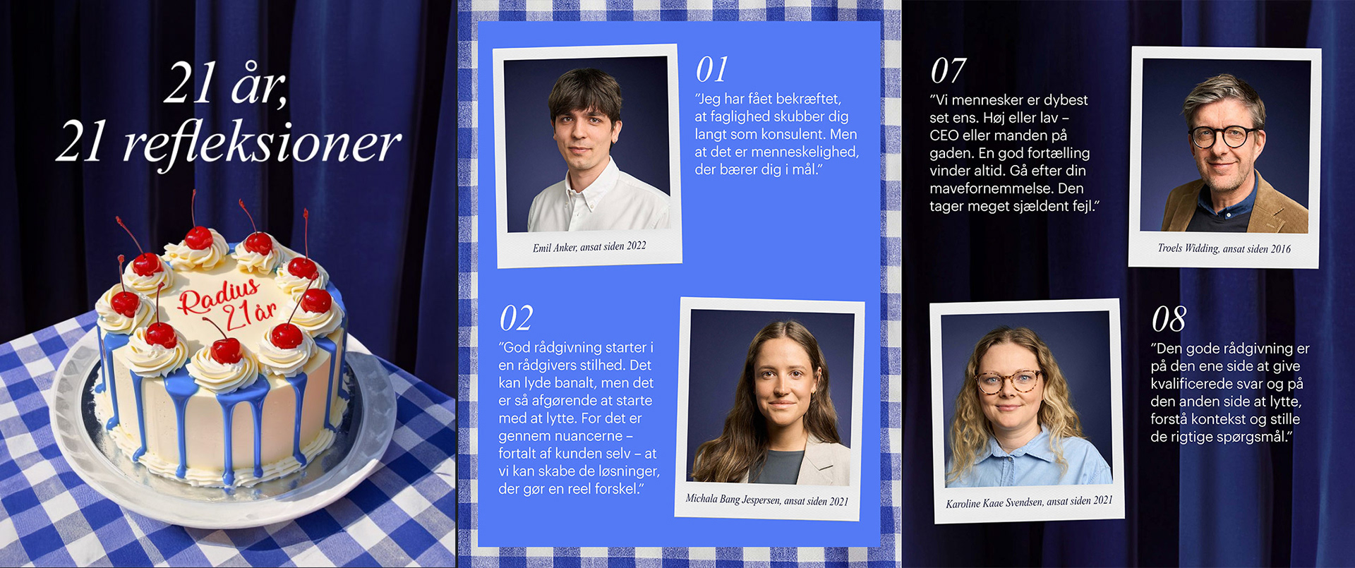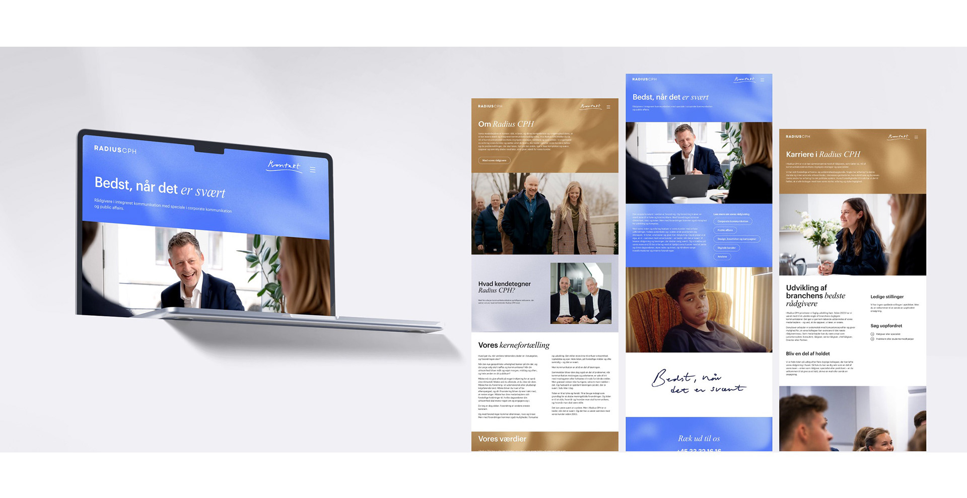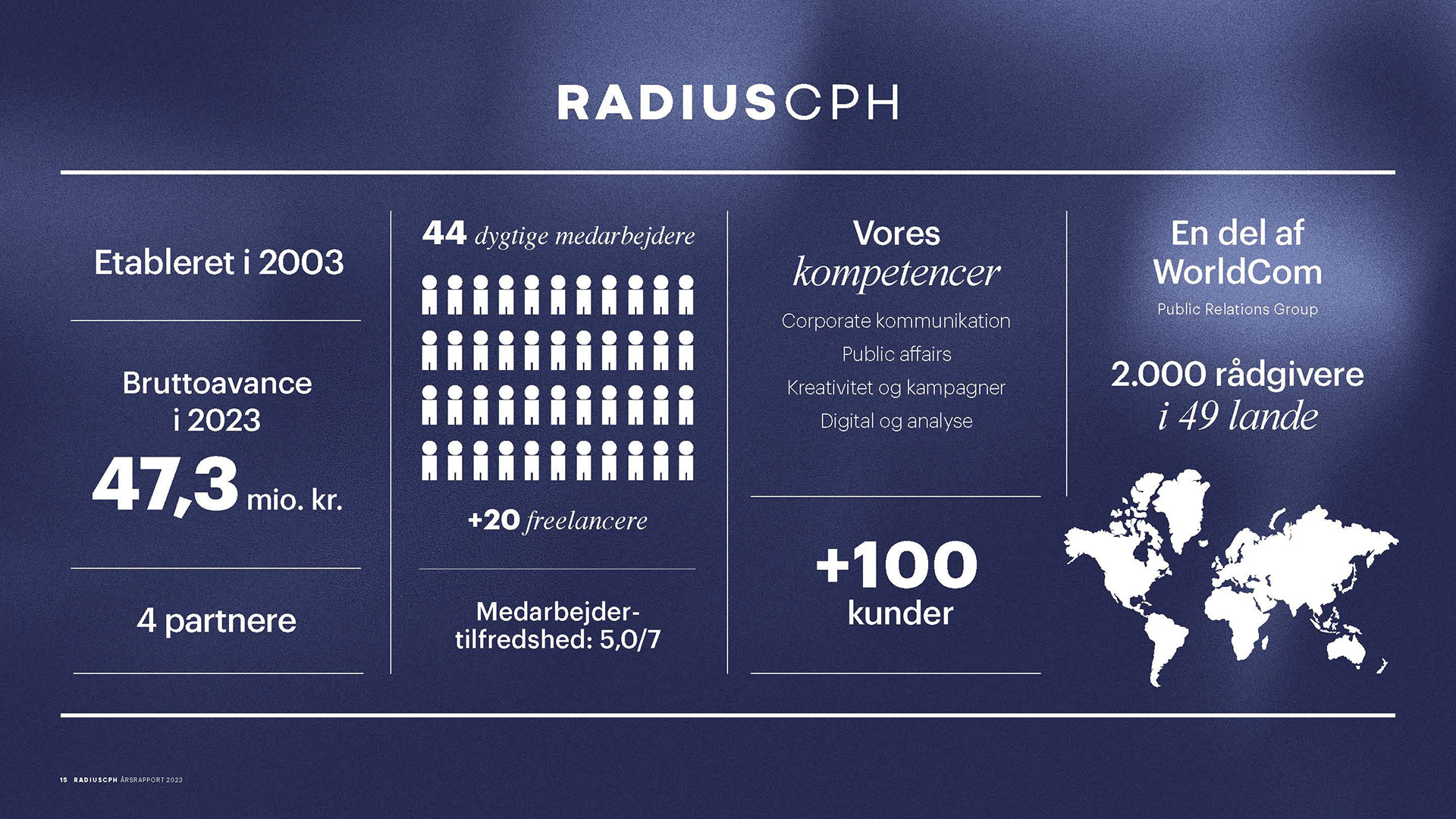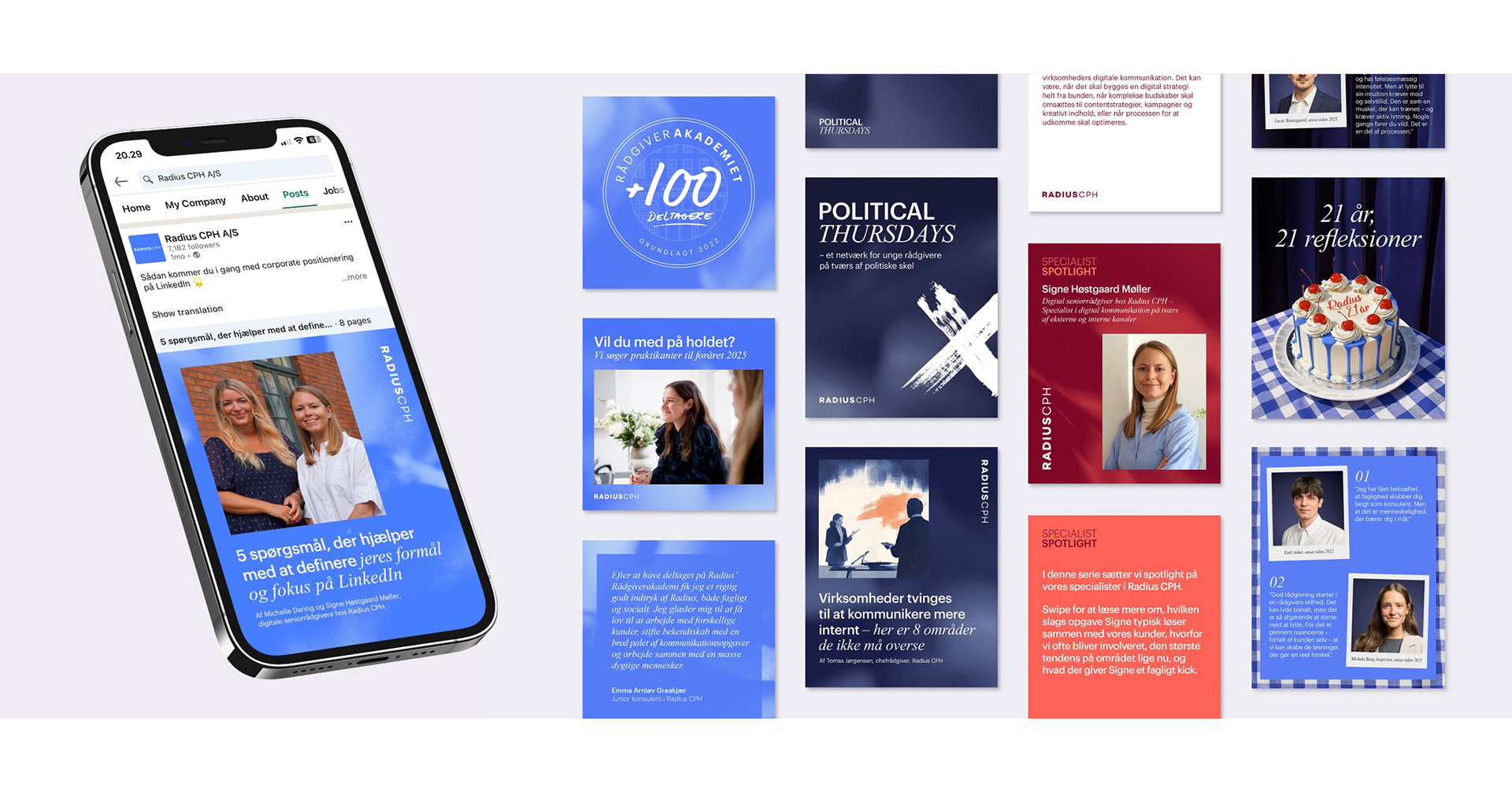 I developed an identity refresh for communications agency Radius CPH. The main objective was to develop a much more dynamic identity, with more warmth and personality, to what had become, a very corporate, black and white consultant look. I created new presentations templates, SoMe style and website. One of the constraints was to work with fonts that wouldn't need to be purchased or implemented, but that everyone already had access to.